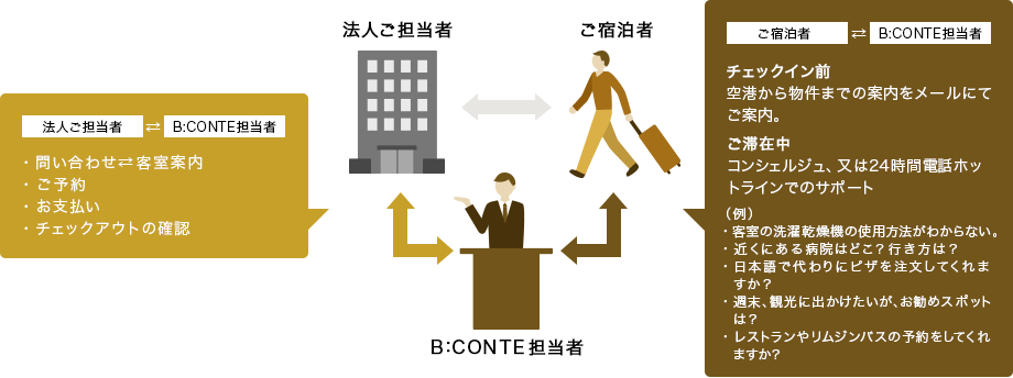 ご担当者様は、予約手配だけ。宿泊者のみなさまのサポートは私達にお任せください。